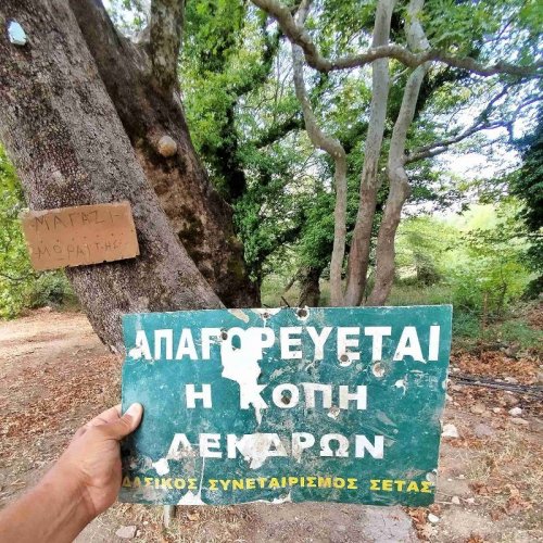 EN - Amboudiotissa church forest. Hand by hand 2 different signs...